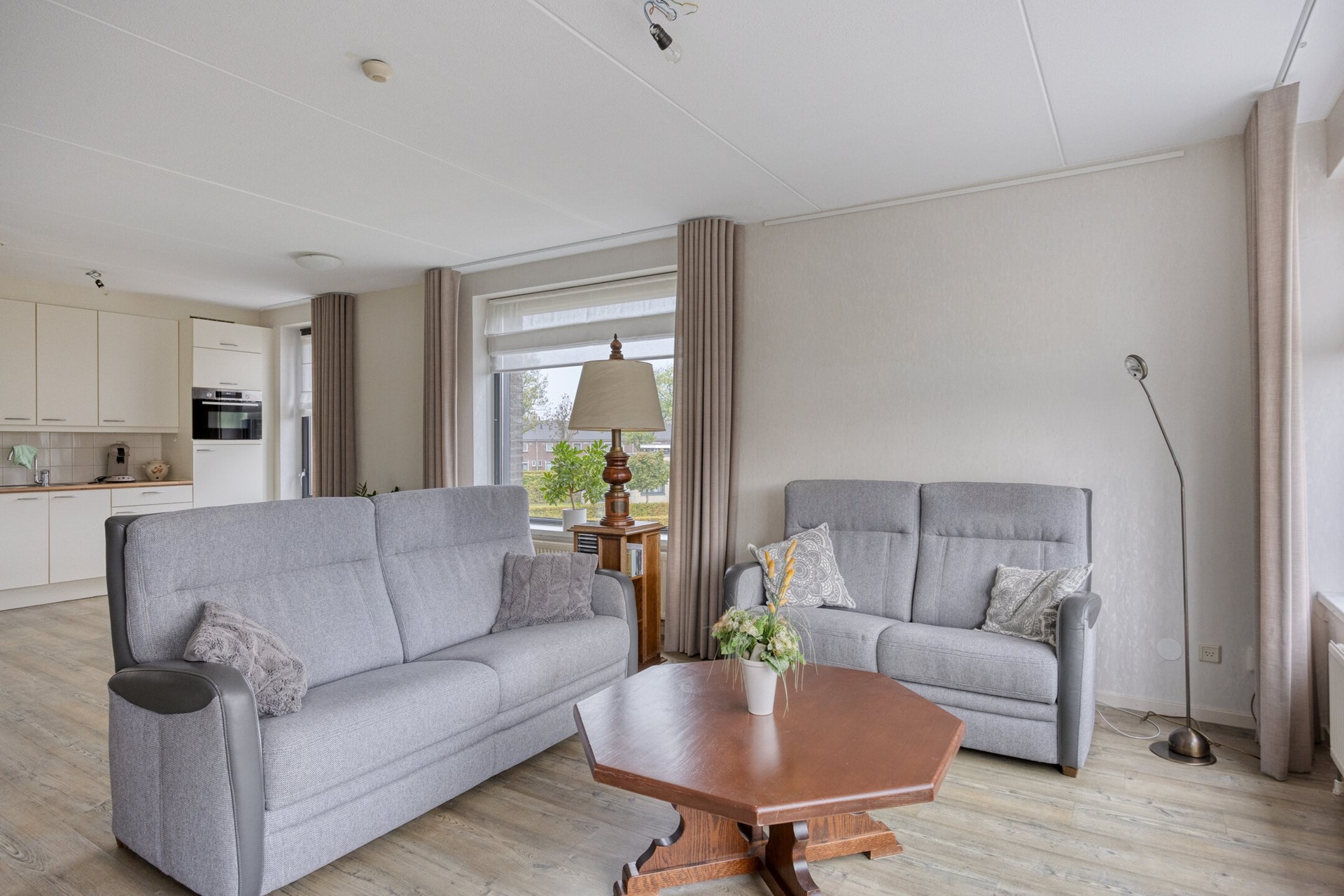 De open keuken is in een hoekopstelling geplaatst en praktisch ingericht met onder andere een koelkast, 4-pits gasfornuis en afzuigkap. De moderne pvc-vloer loopt door over de hele verdieping, wat zorgt voor een strakke en rustige uitstraling.