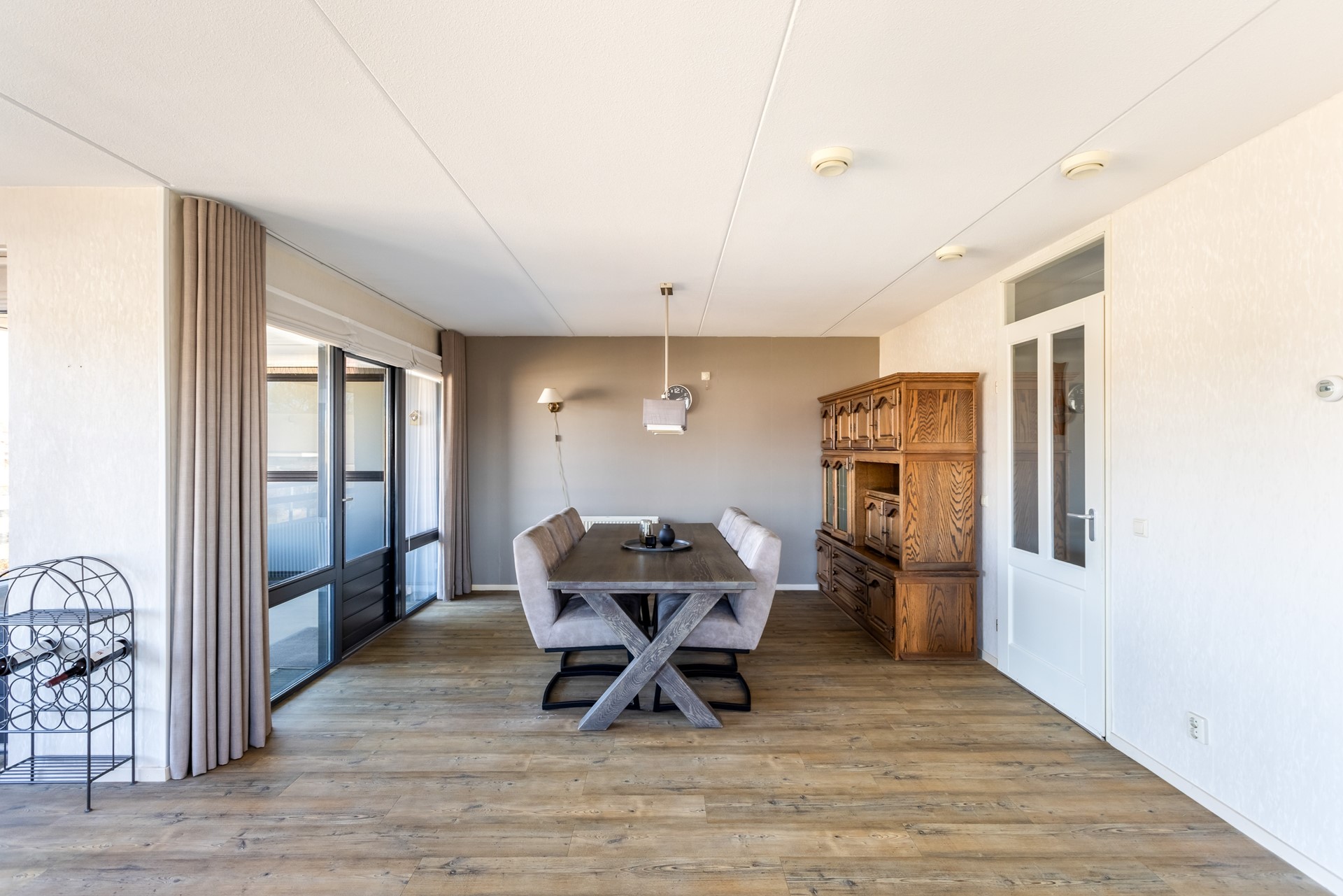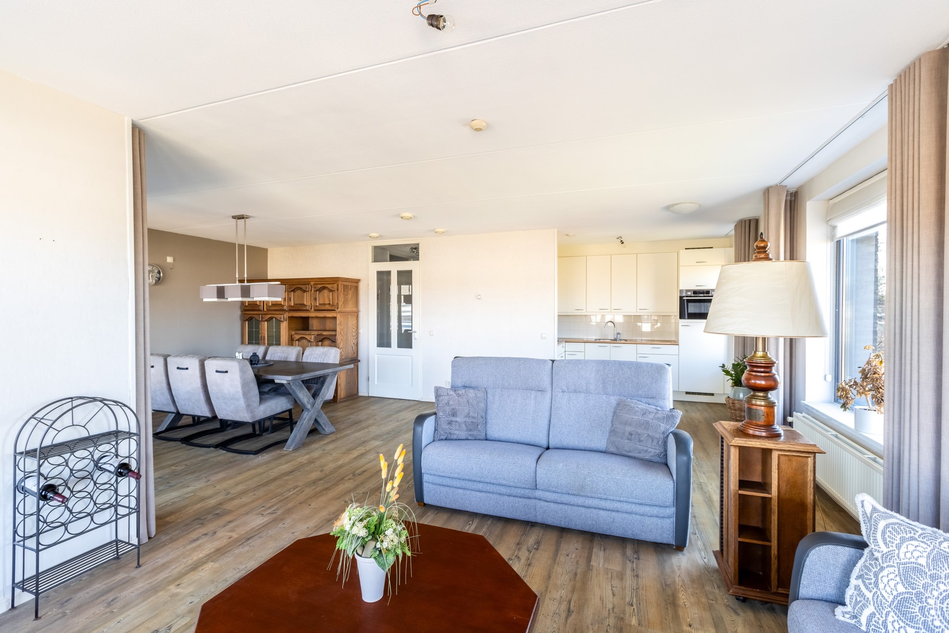 De woonkamer is een fijne, open leefruimte met grote raampartijen die zorgen voor een overvloed aan daglicht. Vanuit hier stap je zo het balkon op.