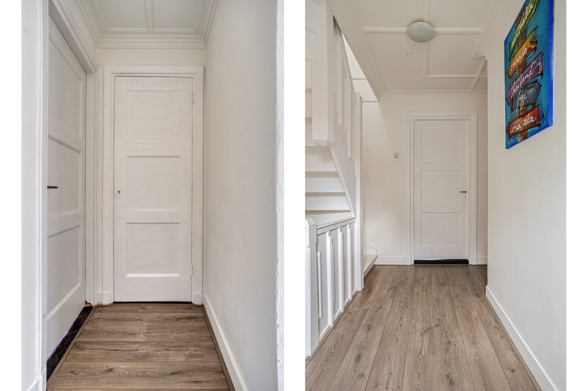 Via de karakteristieke voordeur stap je binnen in de entree, waar het klassieke tegelpatroon meteen de toon zet. De gerenoveerde toiletruimte bevindt zich aan je rechterhand, en via een prachtige glas-in-lood deur loop je door naar de woonkamer.
