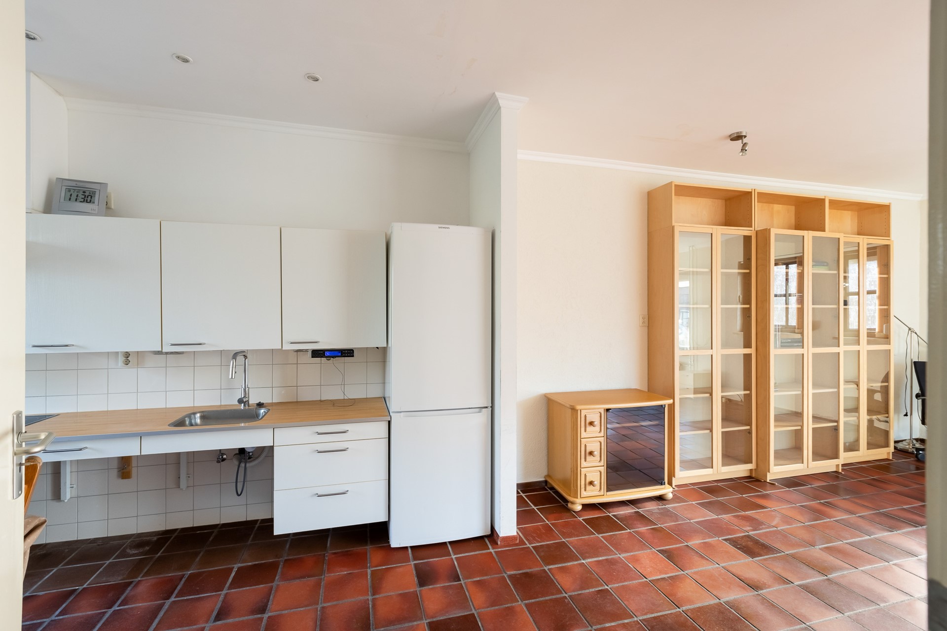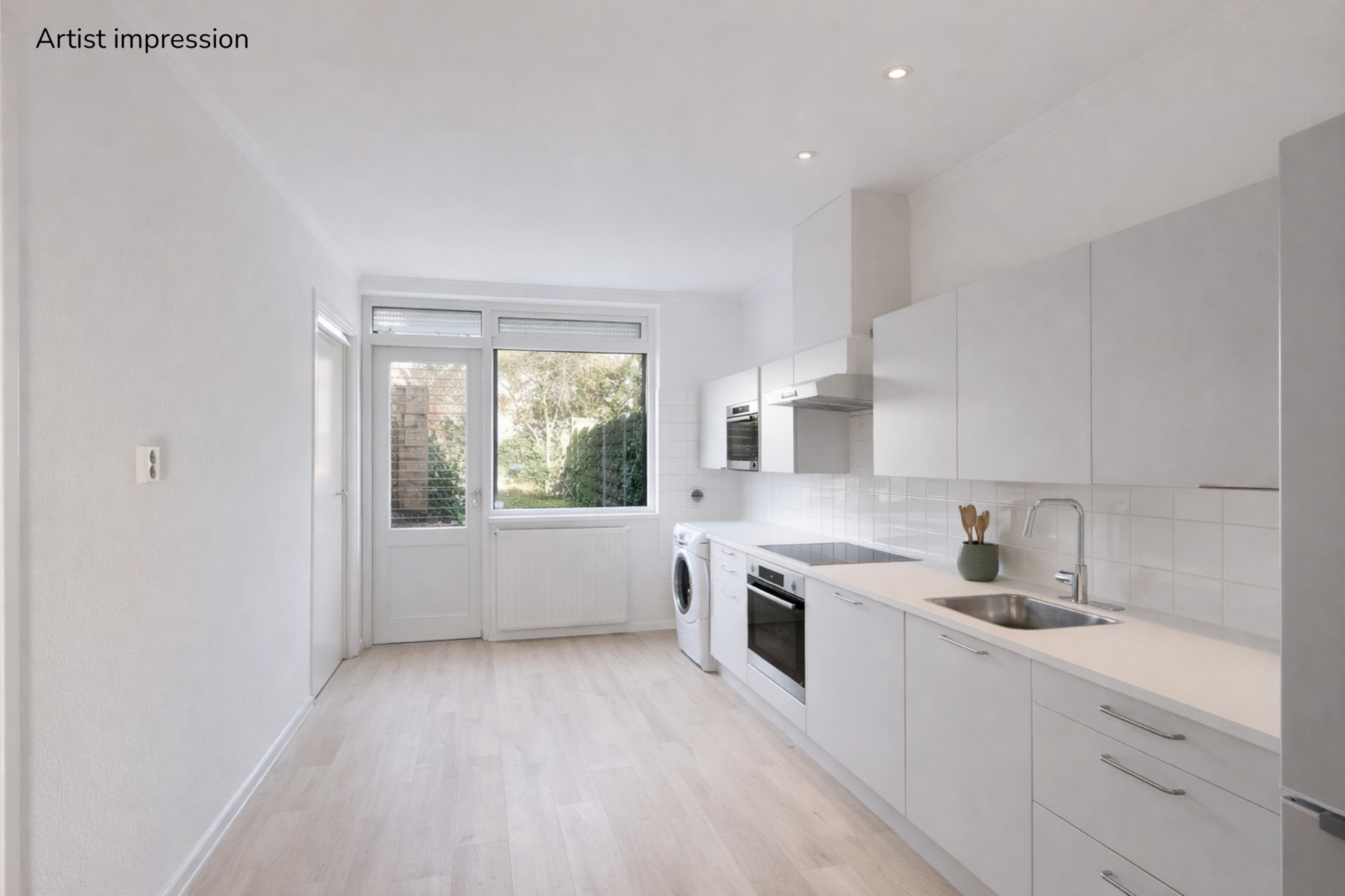 De keuken is eenvoudig uitgevoerd, maar functioneel ingericht met een inductieplaat, afzuiging en voldoende kastruimte. Vanuit hier heb je toegang tot de achtertuin.