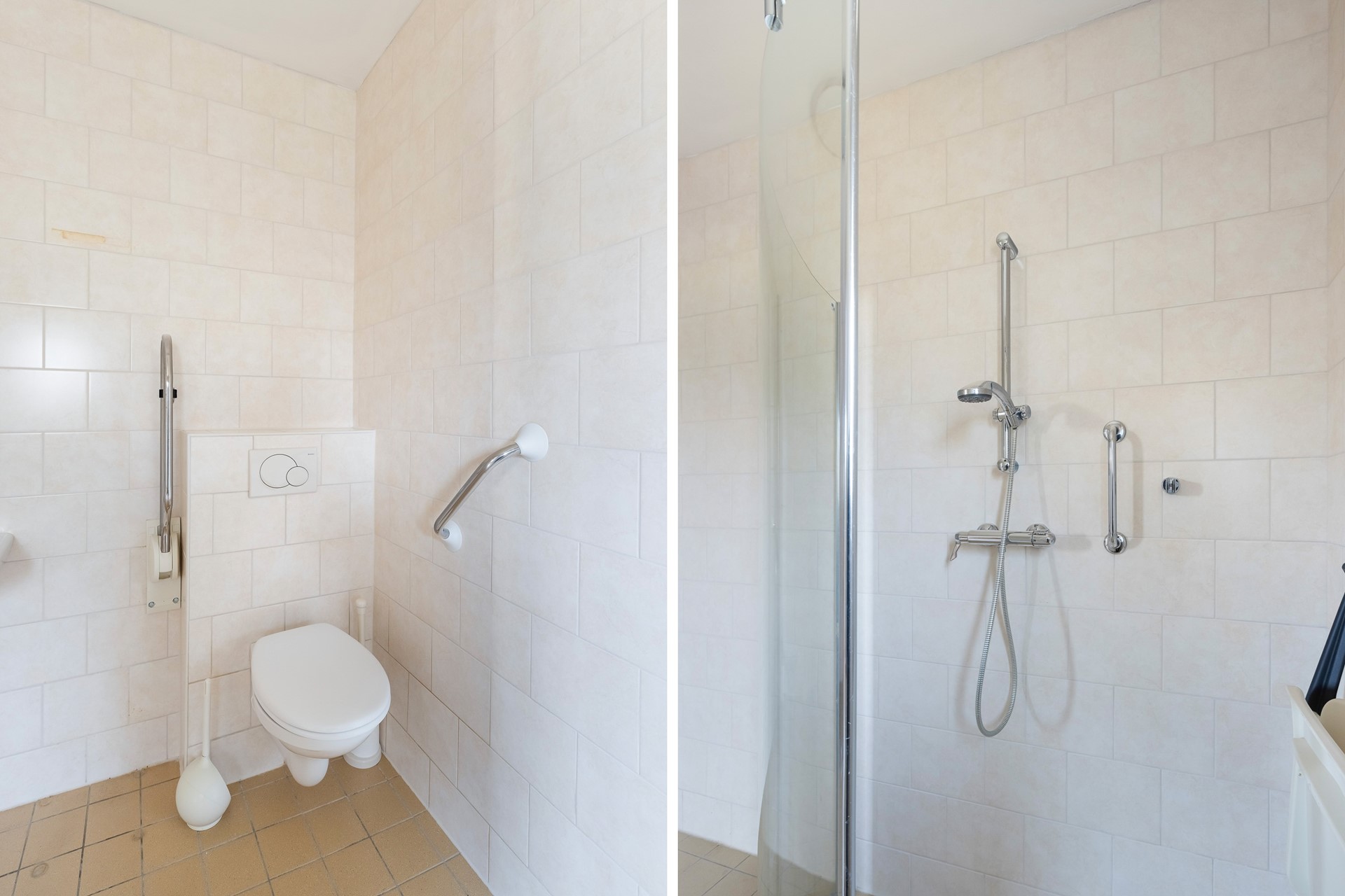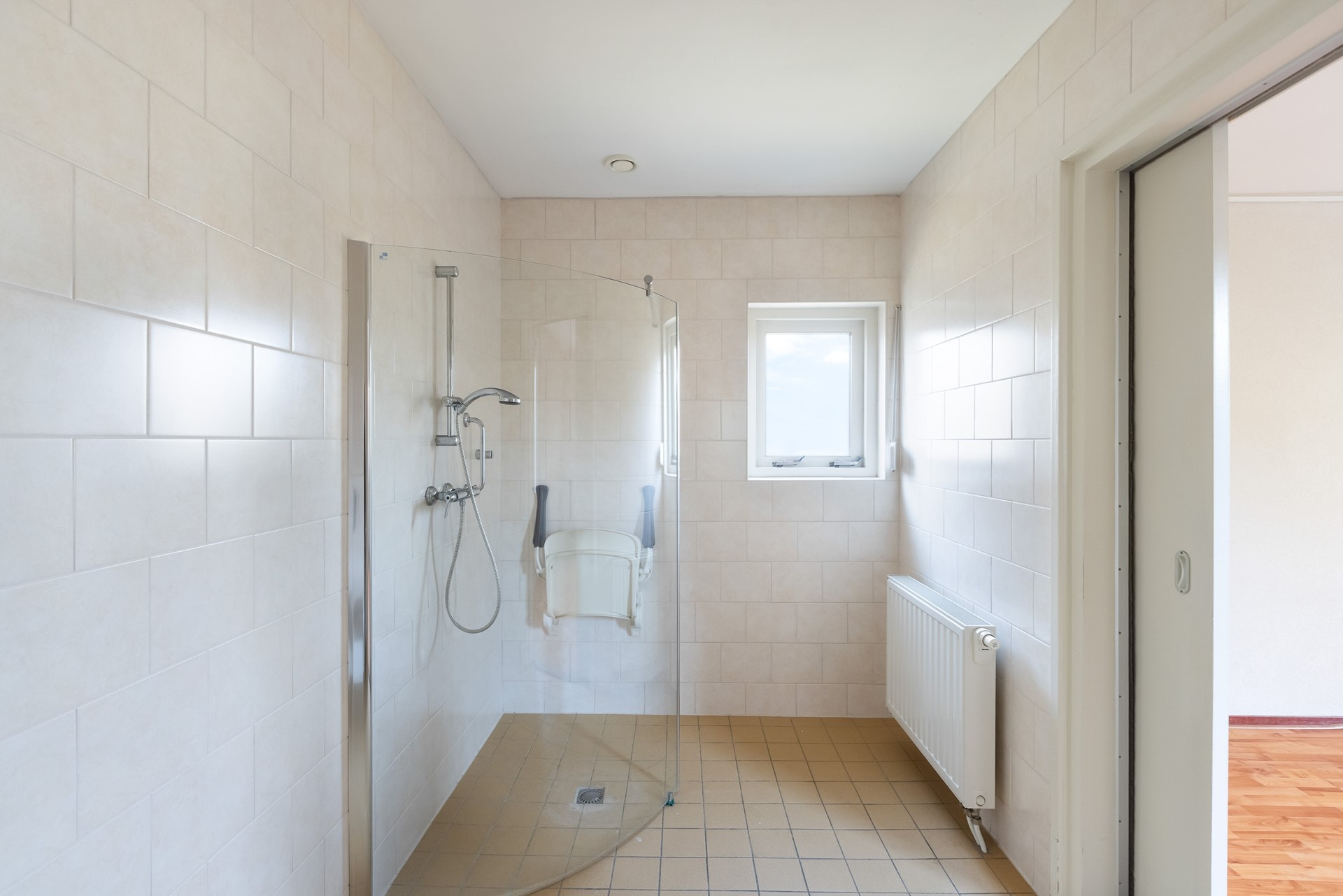 De badkamer beneden grenst aan de slaapkamer en beschikt over een toilet, wastafel en douche. Gelijkvloers wonen? Hier kan het.