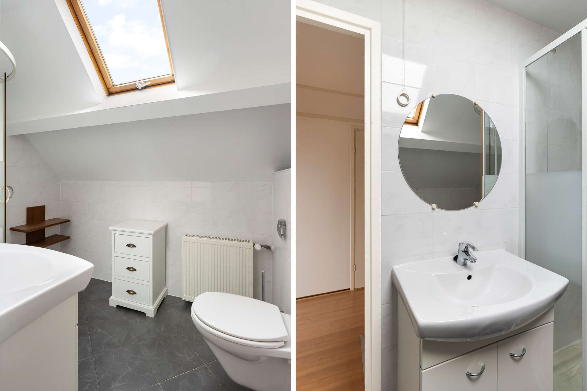 De tweede badkamer is uitgerust met een toilet, wastafelmeubel en douchecabine. Handig voor logés of opgroeiende kinderen die graag hun eigen plek hebben.