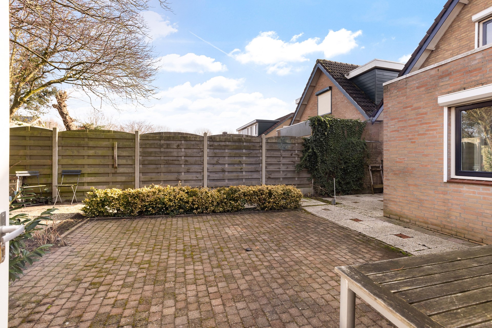 De lange oprit leidt je naar de garage en biedt parkeergelegenheid op eigen terrein. Ideaal voor meerdere auto’s of een camper. En met een waterkraantje aan de voorzijde is ook het onderhoud rondom huis praktisch geregeld.