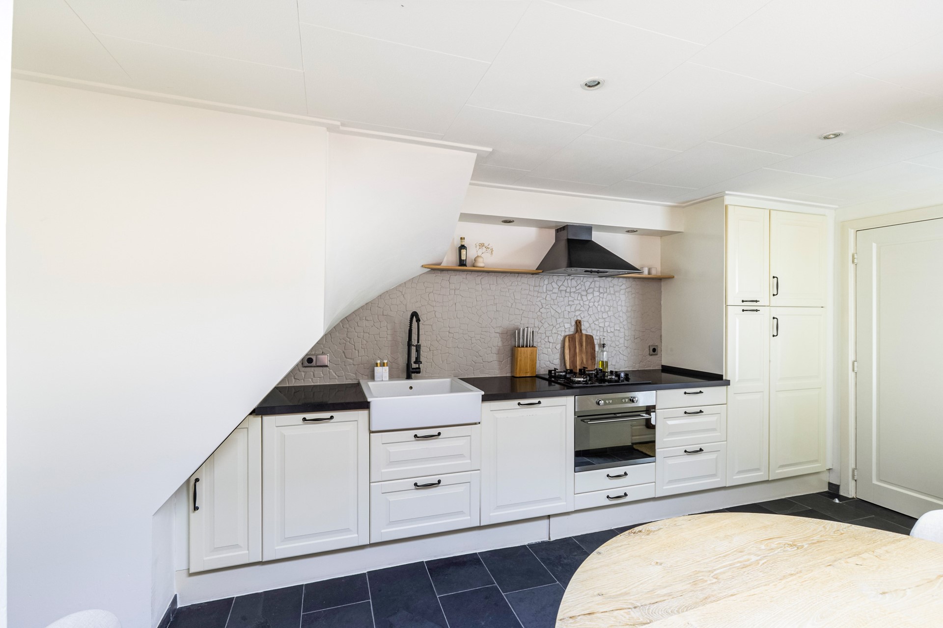 De landelijke keuken in rechte opstelling sluit mooi aan op de woonkamer en is voorzien van diverse inbouwapparatuur, waaronder een koelkast met vriesvak, 4-pits kooktoestel en vaatwasser. Ook is er een apothekerskast aanwezig en is er volop bergruimte. Dankzij de lichtkoepel valt het daglicht hier prettig naar binnen en via de open nis blijft de connectie met de woonkamer. Een fijne plek om te koken, te leven en gezellig bij elkaar te zijn.