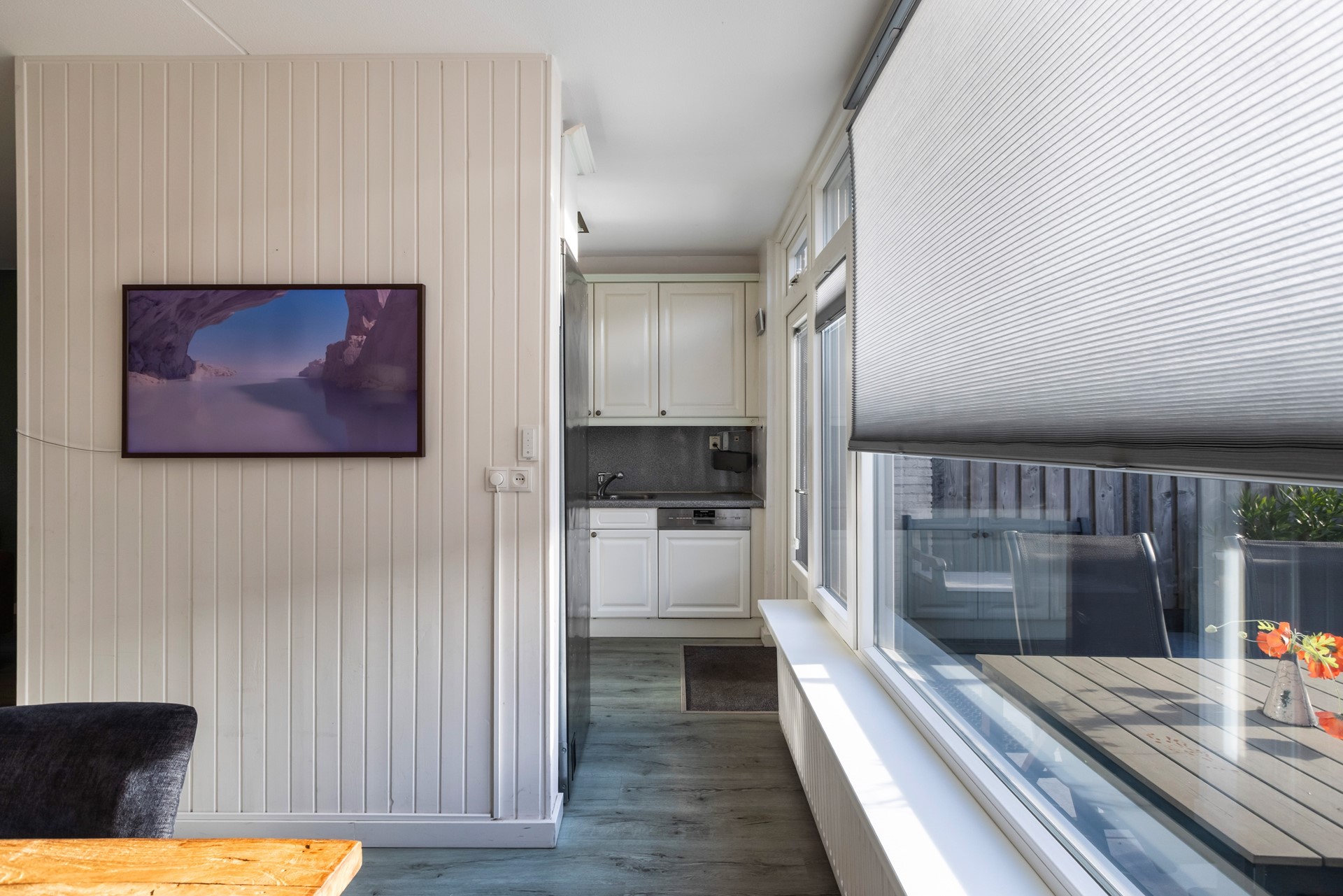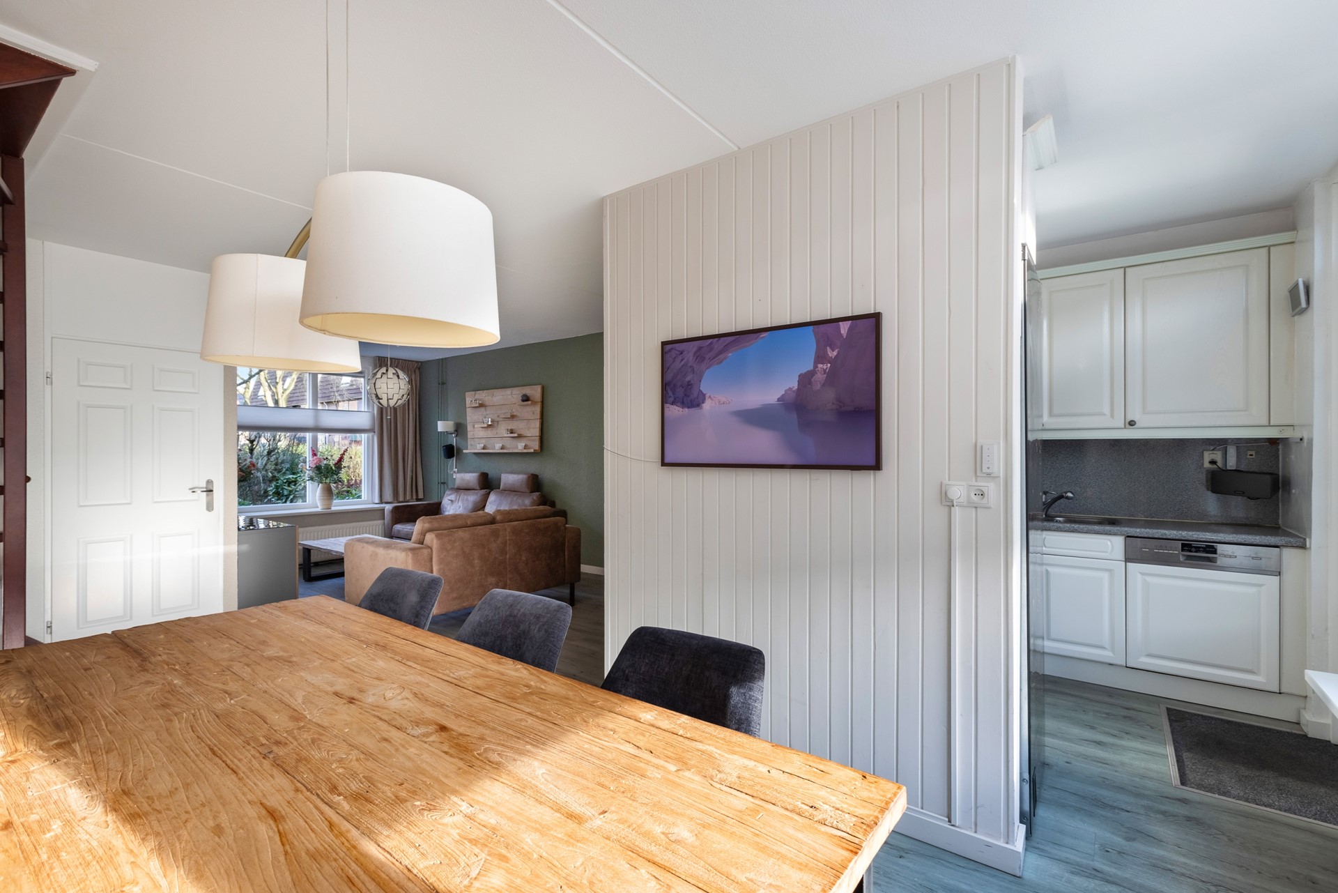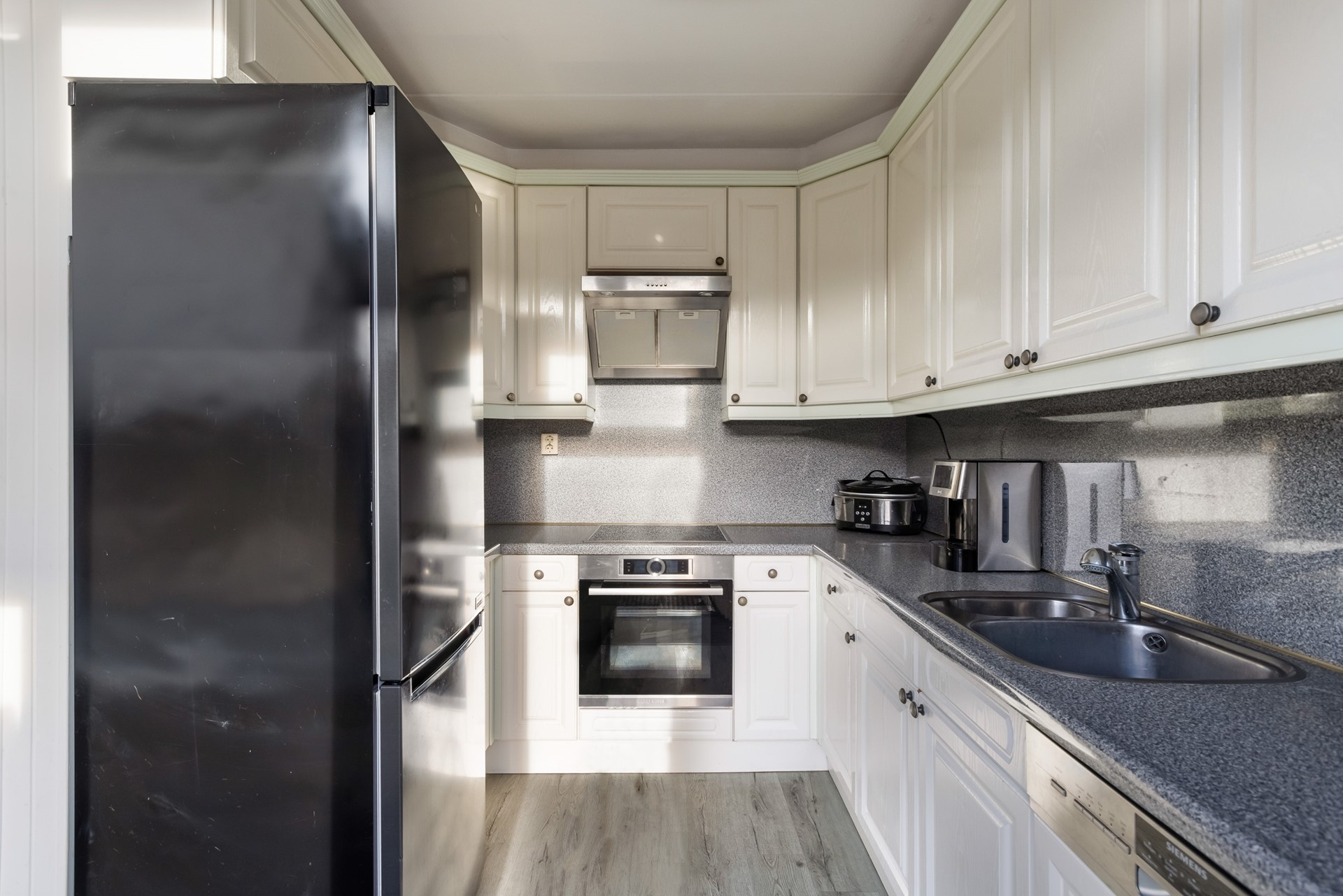 De woonkamer is heerlijk licht dankzij de grote kunststof kozijnen aan zowel de voor- als achterzijde. De combinatie van een pvc-vloer en de open verbinding met de eethoek maakt het een fijne leefruimte. De halfopen keuken is voorzien van een 4-pits inductiekookplaat, combi oven/magnetron en een vaatwasser. Prima functioneel en geeft nog ruimte voor jouw eigen inzicht.