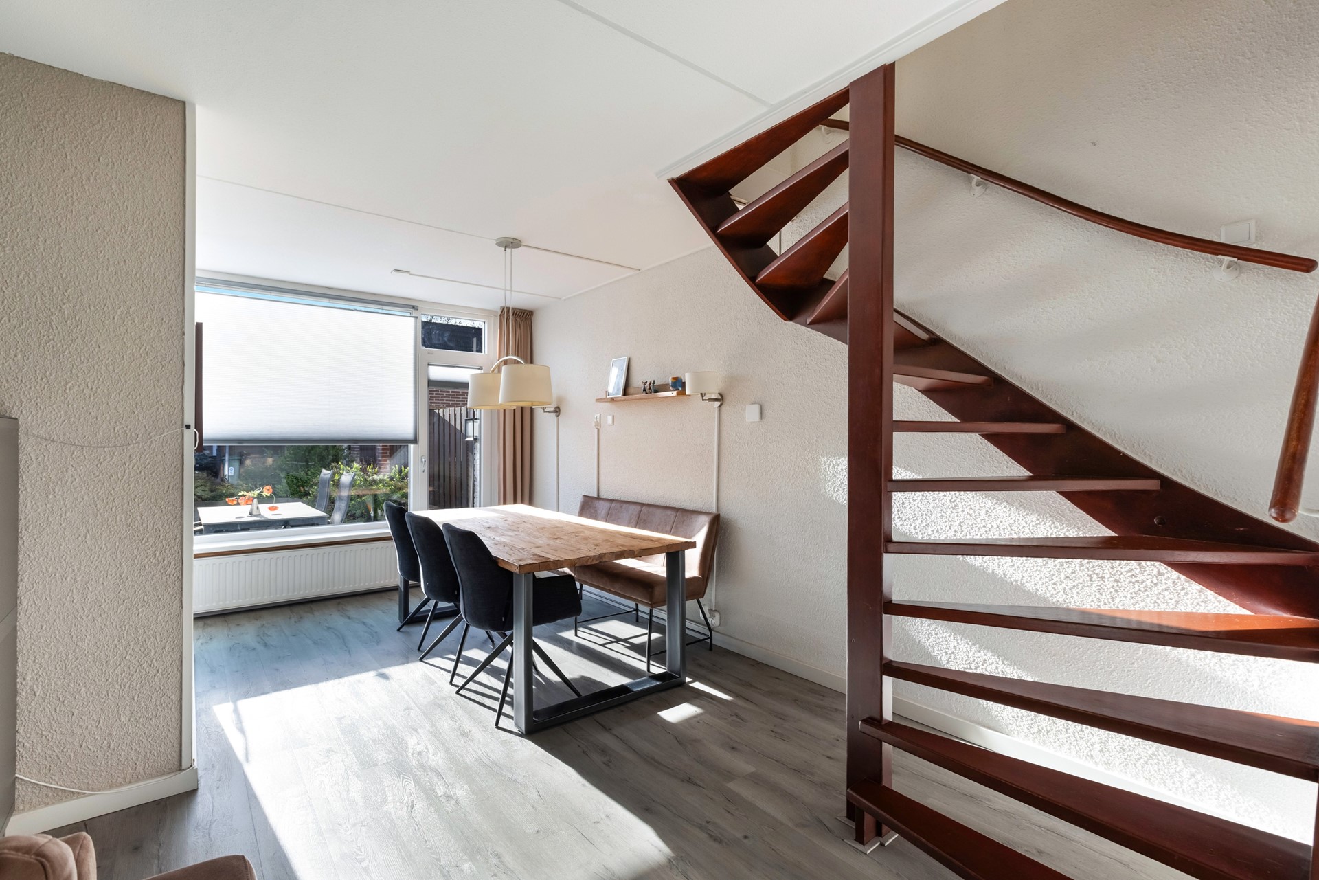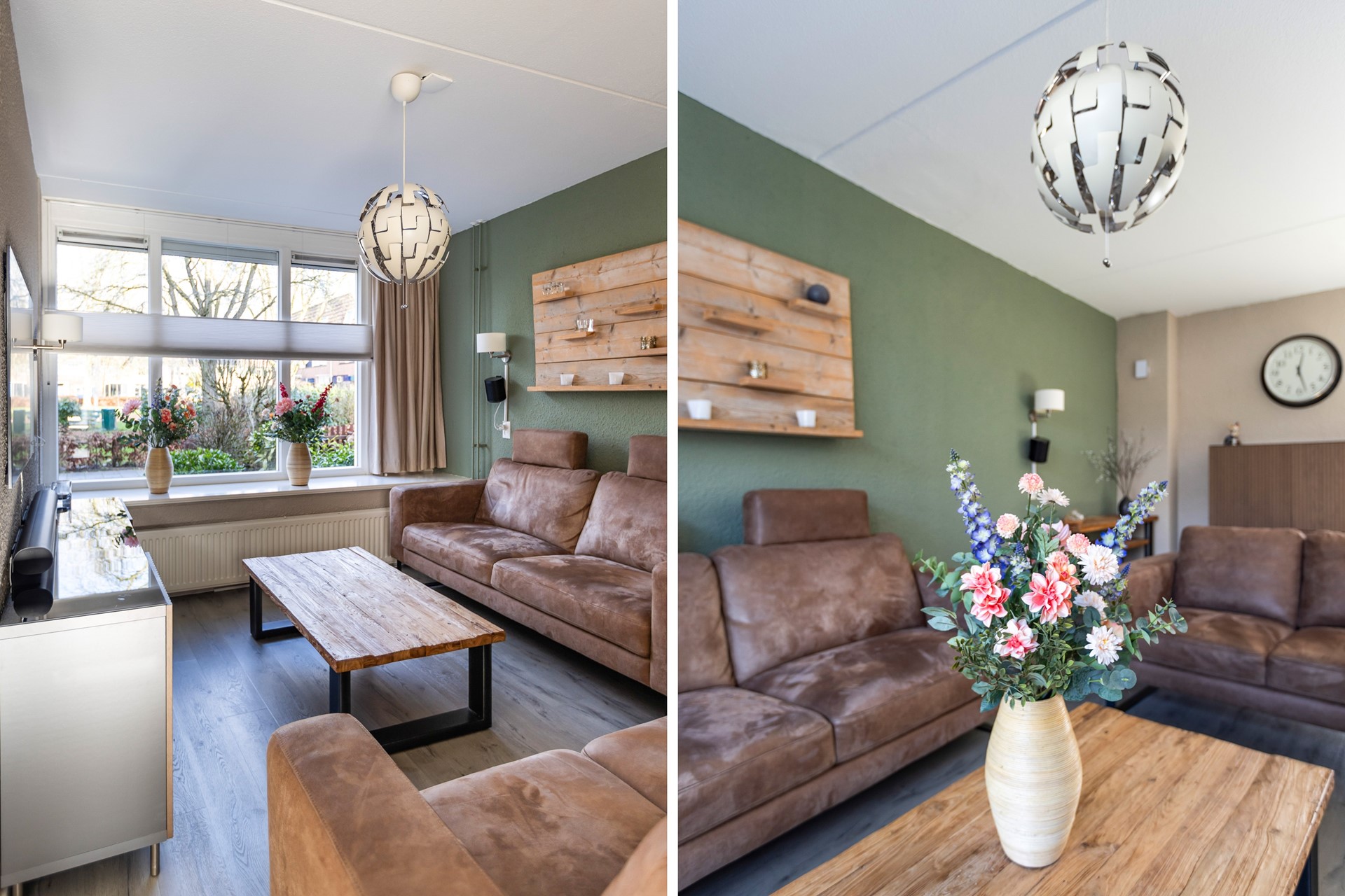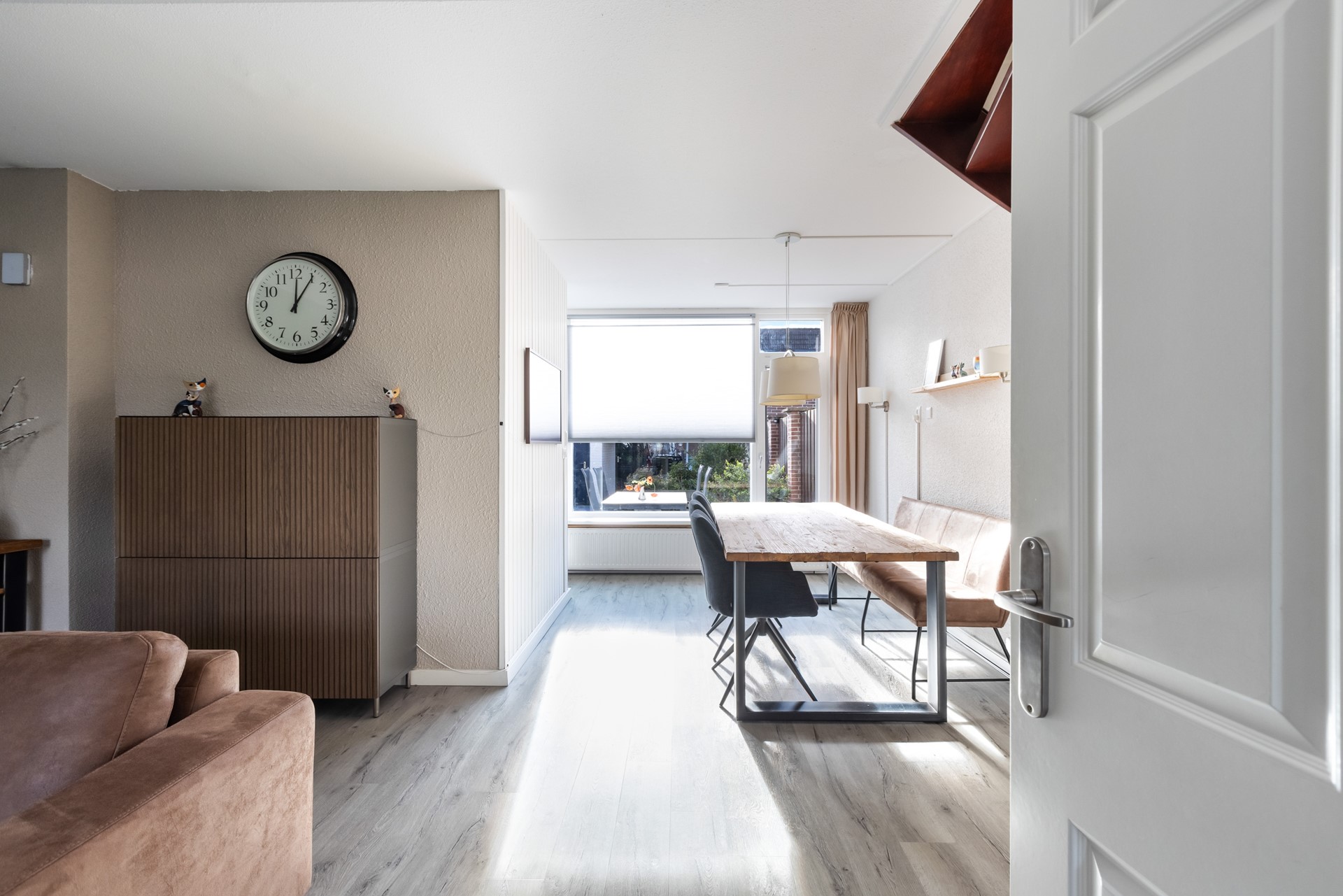 De woonkamer is heerlijk licht dankzij de grote kunststof kozijnen aan zowel de voor- als achterzijde. De combinatie van een pvc-vloer en de open verbinding met de eethoek maakt het een fijne leefruimte. De halfopen keuken is voorzien van een 4-pits inductiekookplaat, combi oven/magnetron en een vaatwasser. Prima functioneel en geeft nog ruimte voor jouw eigen inzicht.