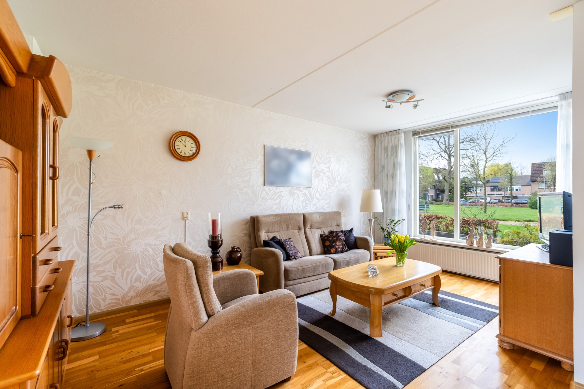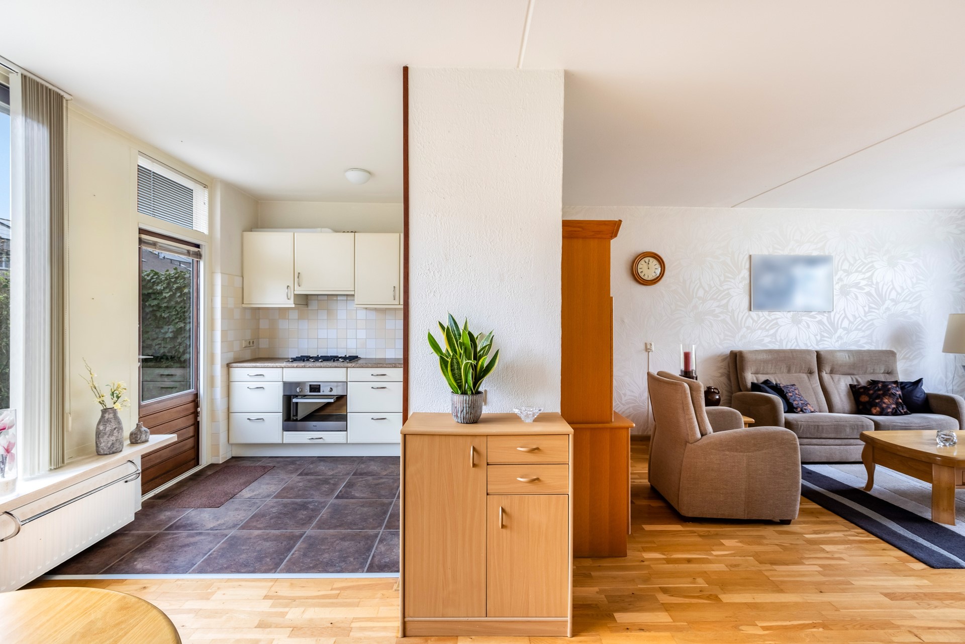 Zodra je de woonkamer binnenstapt, valt direct het prettige uitzicht op. Aan de voorzijde is de zithoek gesitueerd, met een fijn zicht over het groen en de speeltuin. Dankzij het royale kozijn komt er een aangename hoeveelheid daglicht naar binnen, wat de ruimte een open en uitnodigend karakter geeft. Aan de tuinzijde bevindt zich de eethoek, in directe verbinding met de half open keuken.