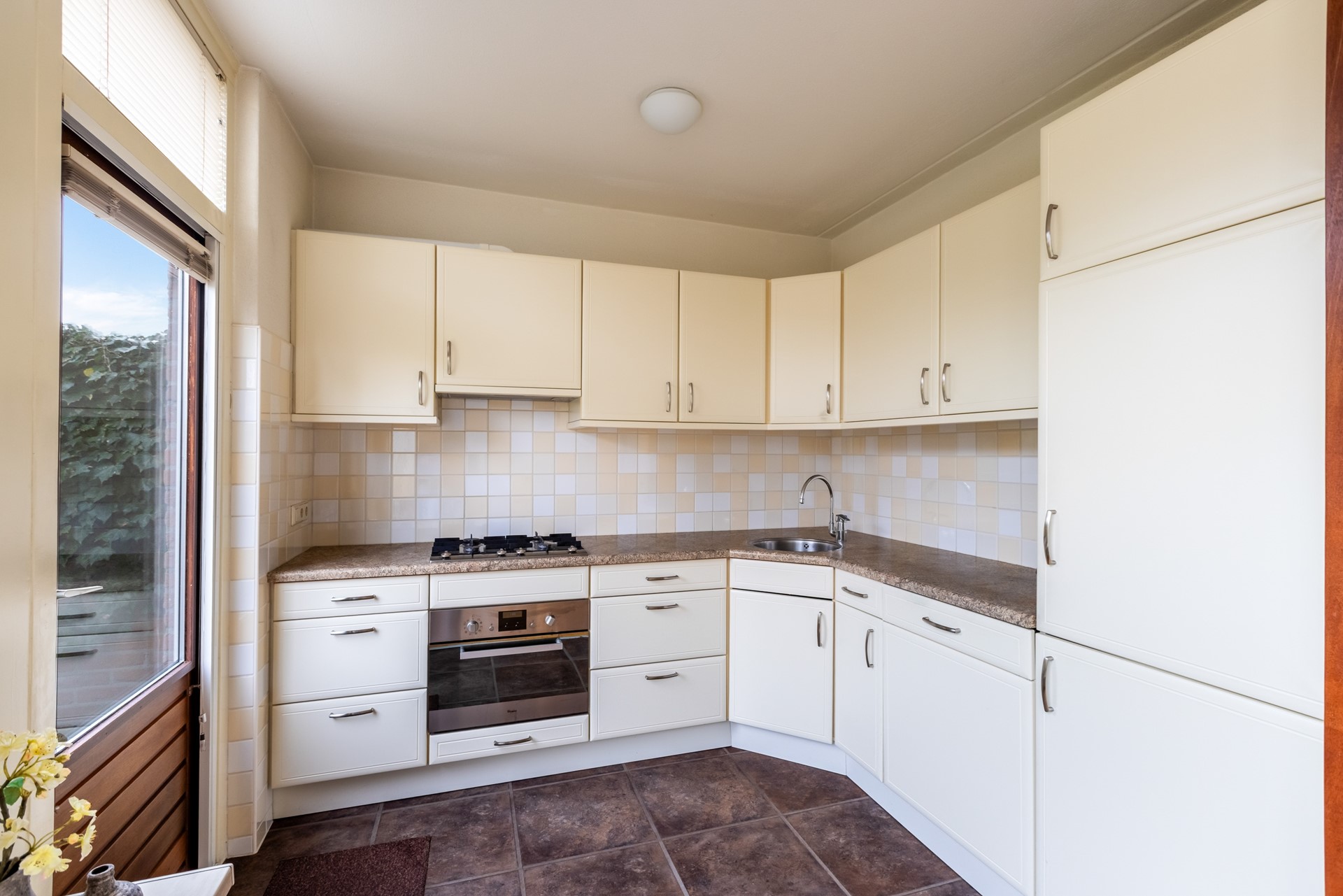 De keuken is praktisch ingedeeld en voorzien van diverse inbouwapparatuur, waaronder een vaatwasser, koelkast, fornuis en een combi oven/magnetron. Vanuit de keuken loop je zo de achtertuin in.