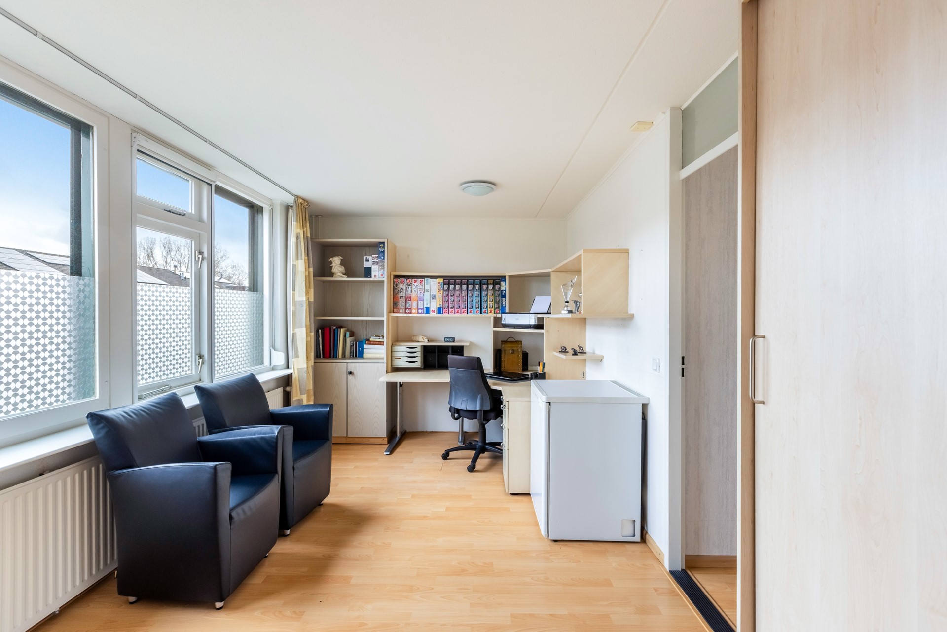 Via een vaste trap bereik je de zolderverdieping. Deze etage is opgedeeld in een voorzolder en een aparte werkkamer. Uiteraard is deze kamer ook prima te gebruiken als 3e slaapkamer, hobbyruimte of fijne thuiswerkplek. Op dit moment is de ruimte in gebruik als hobbykamer en vind je hier ook de wasmachineaansluiting en een extra wastafel.