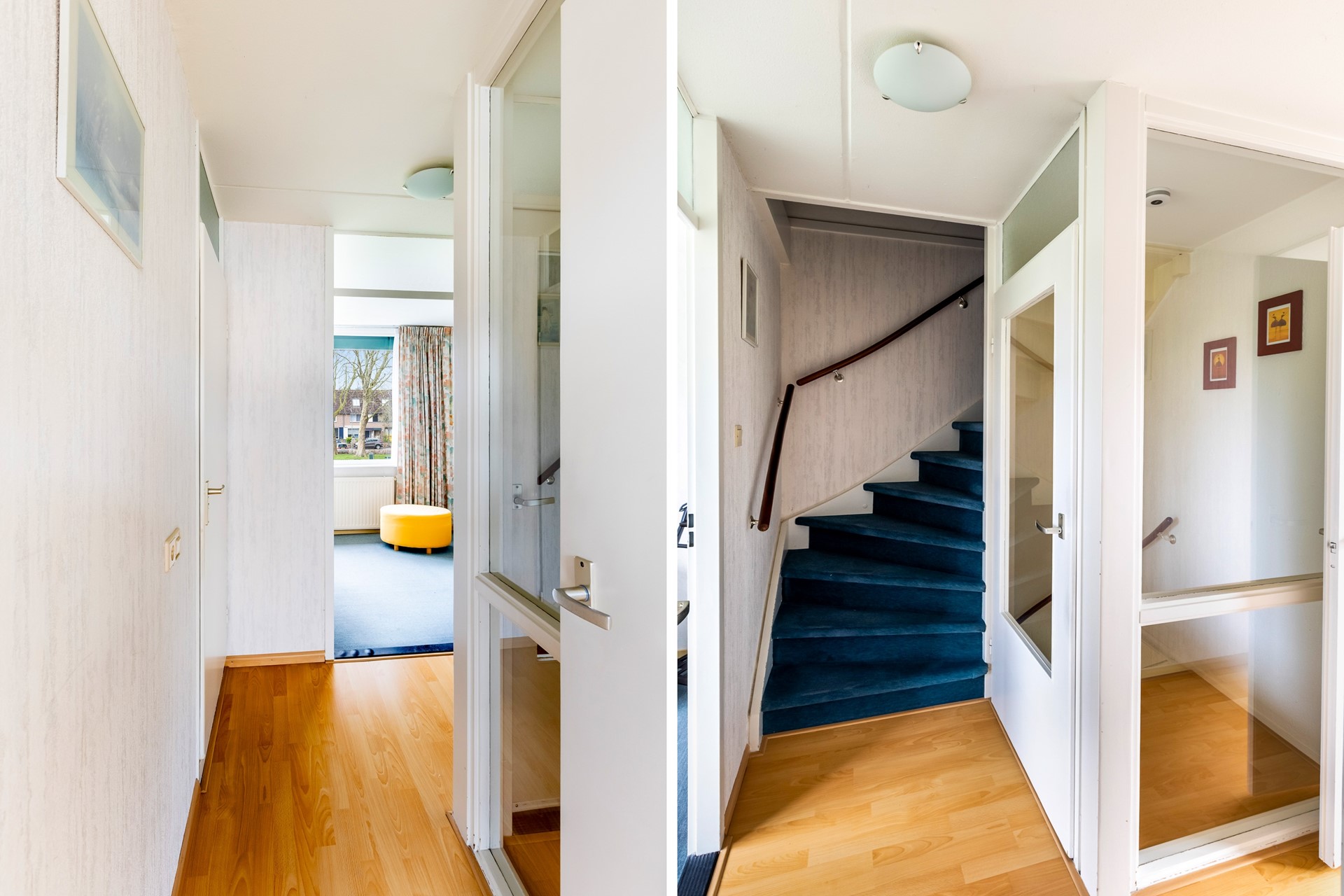 Via de voortuin bereik je de voordeur van de woning. In de hal vind je de meterkast, het toilet met fonteintje en de toegang naar de woonkamer.